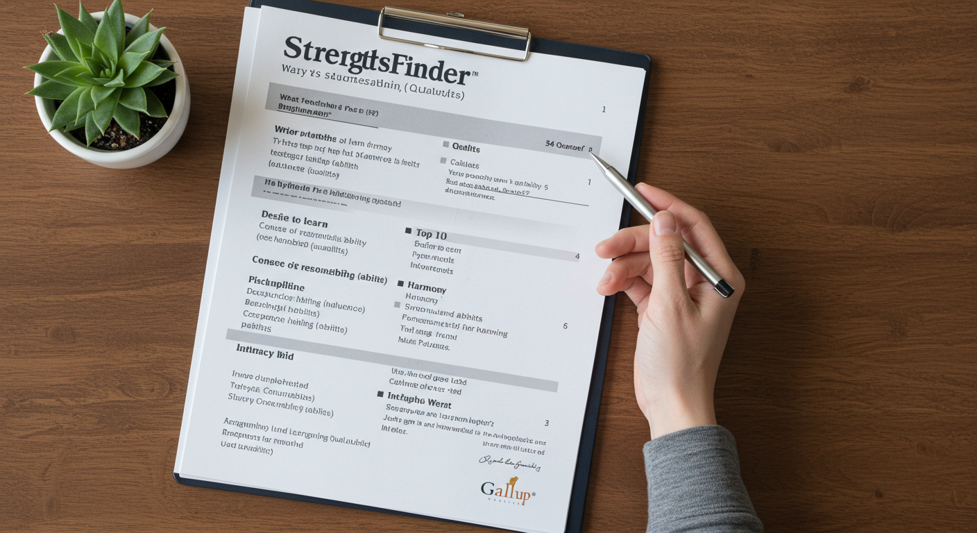 ストレングスファインダーは、米ギャラップ社が開発した「強み診断」ツールです。34の資質(才能)から自分の特性を順位づけしてくれるもので、企業研修やキャリア開発の現場でも広く使われています。